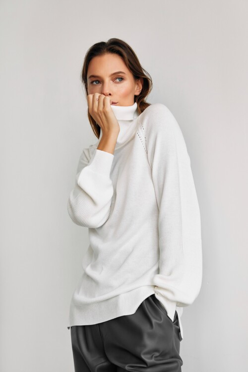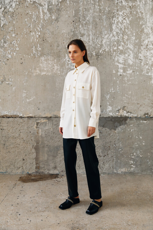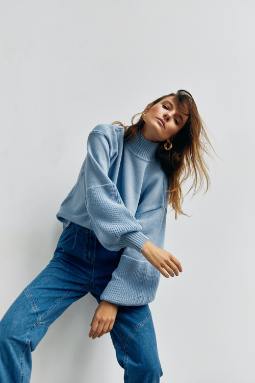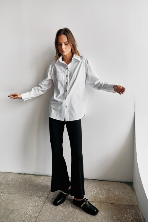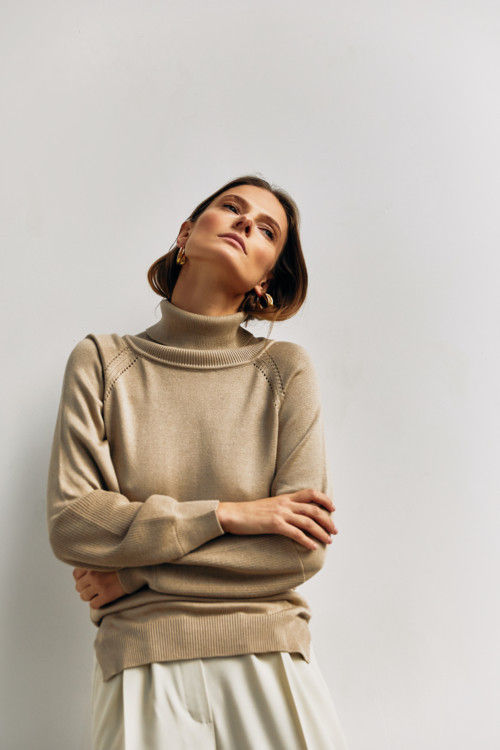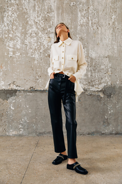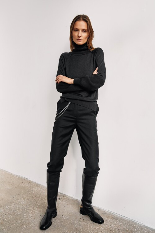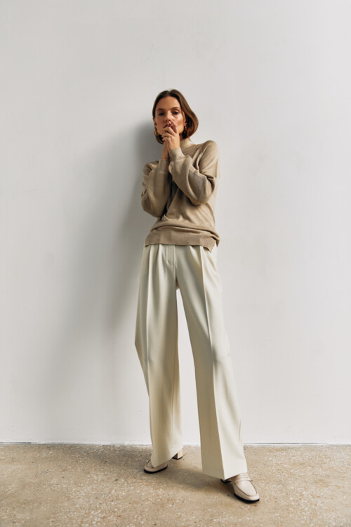 KohaiБрюки + свитерЗимой хочется чувствовать максимальный комфорт, но при этом важно не забывать про соблюдение рамок дресс-кода. Так, если в спортивных джоггерах и худи можно отправиться на прогулку, то для повседневных дел лучше подойдут утилитарные брюки и базовый свитер. Одно из самых практичных решений на каждый день может выглядеть абсолютно по-разному. Украинский бренд Kohai предлагает несколько вариантов, которые придутся по вкусу каждой моднице. Наш фаворит: монохромный ансамбль в оттенках нюда, состоящий из лаконичного свитера и брюк-палаццо. Дополнить такой образ можно с помощью лоферов на каблуке и сумки-тоута.