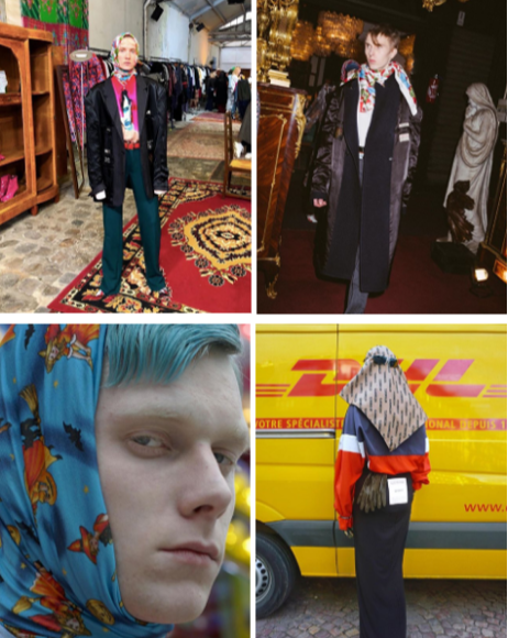 Бренд Vetements предлагает сразу несколько альтернативных способов применения бабушкиного платка: во-первых, его можно повязывать в стиле вестерн, воображая себя Клинтом Иствудом. Во-вторых, носить как арабскую гутру, закрепив вместо шнура очками. В-третьих, косынка отлично гармонирует с бейсболкой. В-четвертых, идеально смотрится образ, в котором волосы покрашены в тон аксессуара. Советуем не отставать и смело экспериментировать!