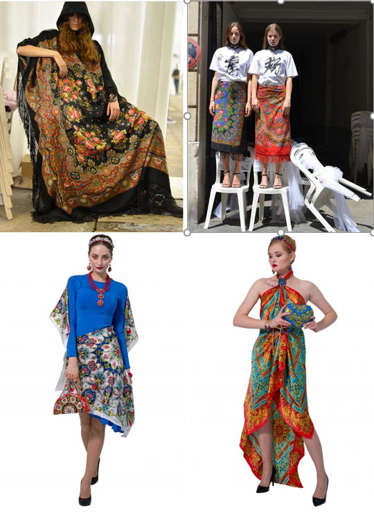 В общем, бабушкиными платками можно обмотаться с ног до головы. Что и делает большинство дизайнеров. Авангардные платья и юбки, в буквальном смысле собранные и связанные из отдельных платков, предлагают Vetements, Marine Serre и HohlomaShop.