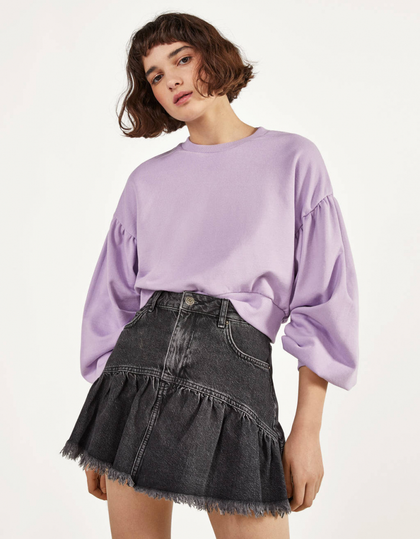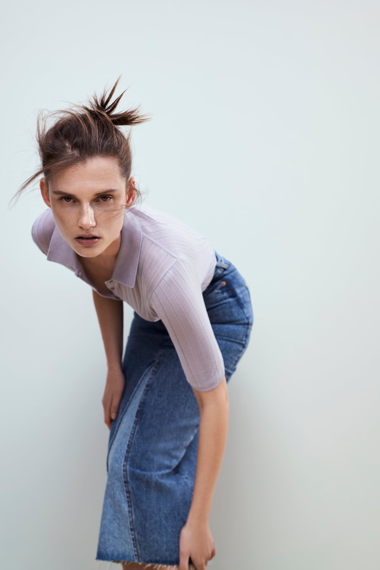 Эта модель вернулась прямиком из 90-х и еще сохранила ментальную связь с бомберами и ободками для волос (запомните эту комбинацию). Пуговицы здесь не только для красоты и удобства — они создают вертикаль, благодаря которой возникает эффект «бесконечных ног». Хорошая пара для такой юбки: актуальная блуза с объемными рукавами или расслабленный свитшот.