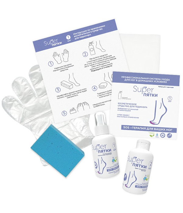 Рецептура этого набора разработана и одобрена подологами Израиля. Состав обогащен экстрактом алое вера, который обладает заживляющим и увлажняющим эффектом. В наборе есть все для проведения ритуала красоты: шаг 1 — размягчающее средство с удобным спреем-дозатором, шаг 2 — крем-концентрат, одноразовое полотенце, перчатки, косметическая пемза, инструкция.