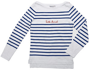 Бренд, который идеально подходит для отдыха — Little Marcel! Пуловер в полоску с красной надписью смотрится очень мило, особенно с короткой юбкой. Нам нравится.