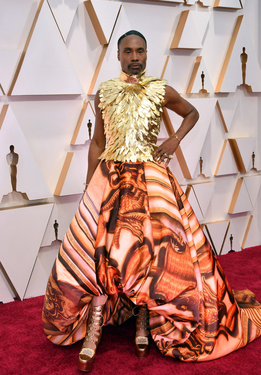 После прошлогоднего выхода в платье-смокинге от Билли Портера никто и не ожидал чего-то традиционного. Звезда сериала "Поза" ожиданий не подвел – на красной дорожке он появился в кутюрном платье от британца Джайлза Дикона. Вдохновлен он убранством Кенсингтонского дворца, в котором проживают герцоги Кембриджские – Уильям и Кейт. По словам актера, его стилист Сэм Раттел в прошлом году посетил это место и решил перенести на принт юбки интерьеры купольного зала дворца. А вот верхняя часть наряда отсылала к золотым колоннам из этого зала и наследию Римской империи. "Нам просто захотелось пофантазировать и связать темнокожего актера с институтом монархии, что еще совсем недавно даже невозможно было представить, – рассказал Раттел. – Это история про наш современный мир, где становится все меньше границ и стереотипов".