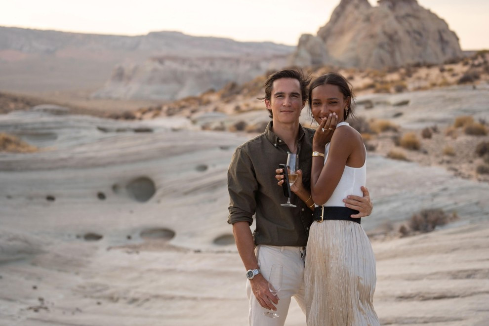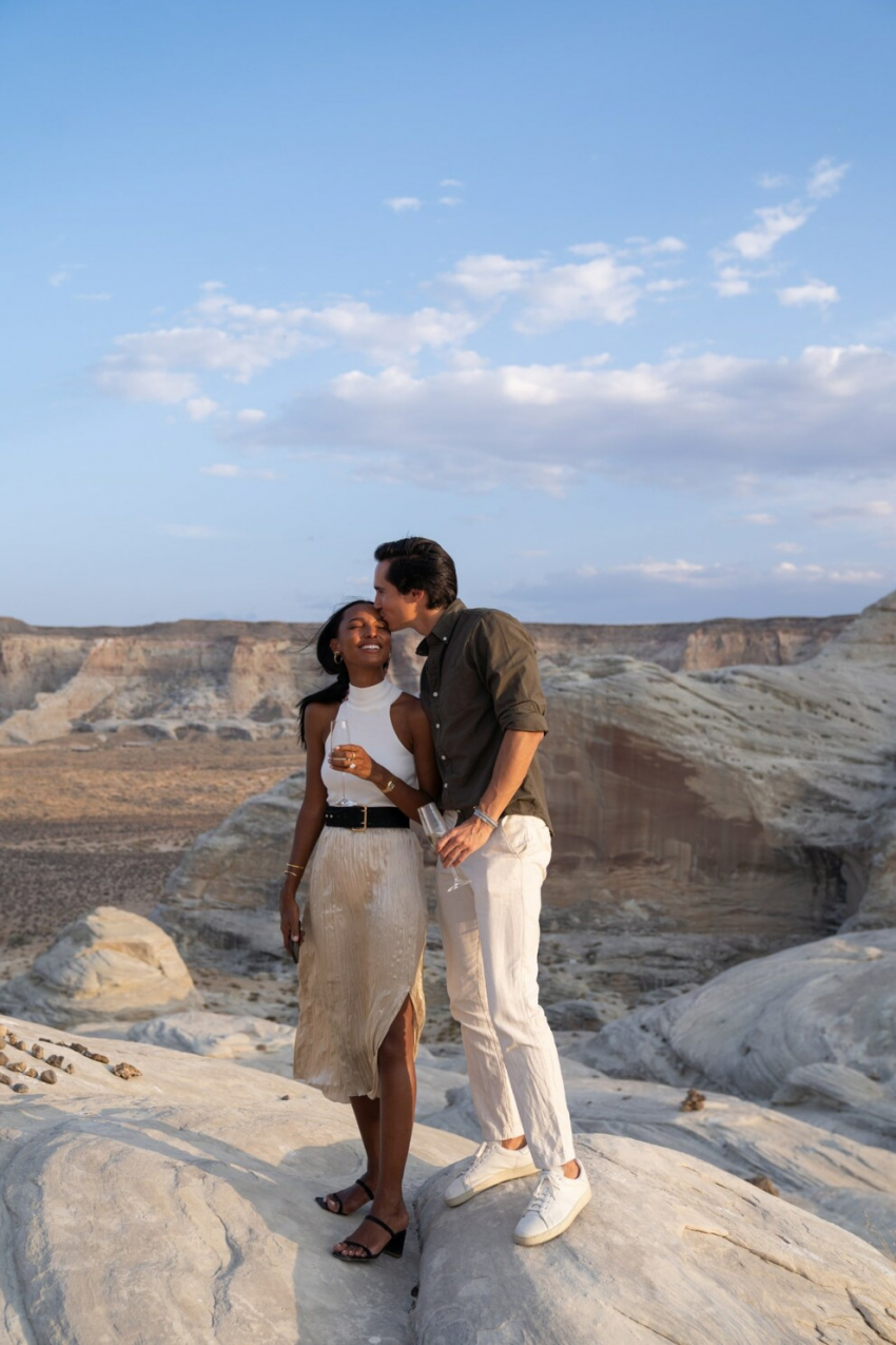 Жасмин Тукс и Хуан Давид БоррероФото: vogue.comЖасмин быстро собрала чемоданы, и они сели в машину. По пути Борреро завязал ей глаза. Их первой остановкой стало место, где они встретились: Rose Cafe в Венеции, Калифорния. После пара направилась в аэропорт, чтобы полететь в еще одно особенное место. «Он так хорошо меня знает, Борреро заказал мой любимый кейтеринг Popeyes – я была в раю! Мы ели куриные котлеты и пили шампанское, пока не приземлились в Пейдже, штат Аризона. Затем мы пересели на вертолет, который доставил нас в самое красивое, потустороннее, уединенное место посреди пустынных скал в Юте. Там были только мы».