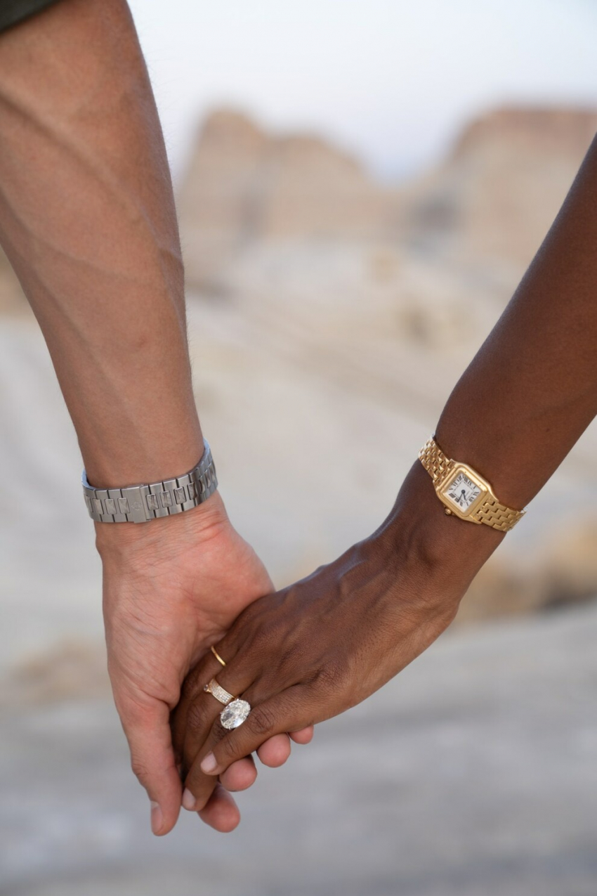 Жасмин Тукс и Хуан Давид БоррероФото: vogue.comНа обозначенной локации пару ждали два стула и стол с шампанским и мясными закусками. Они просидели около часа, наслаждаясь обществом друг друга и любуясь пейзажем. «Вскоре после этого Хуан Давид проводил меня на смотровую площадку наверху, где мы сидели, и на земле лежала куча камней, на которой было написано WYMM? Сначала я не поняла, что это значит, но потом меня осенило: «Ты выйдешь за меня замуж?».