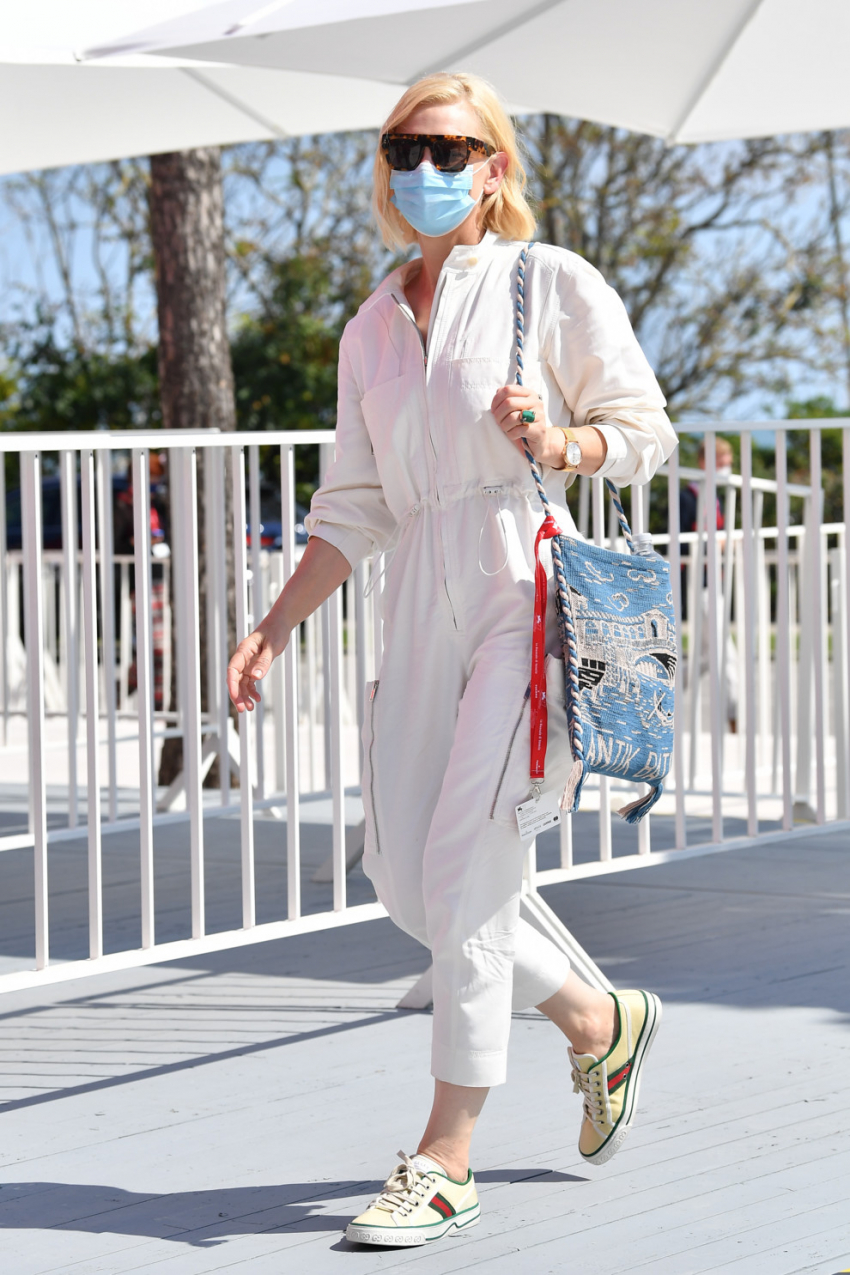 Кейт Бланшетт в Acne StudiosНе менее интересно было рассматривать и повседневные образы Бланшетт в Венеции – от комплекта небесного оттенка Stella McCartney до расслабленного пижамного костюма, украшенного веселыми пальмами.