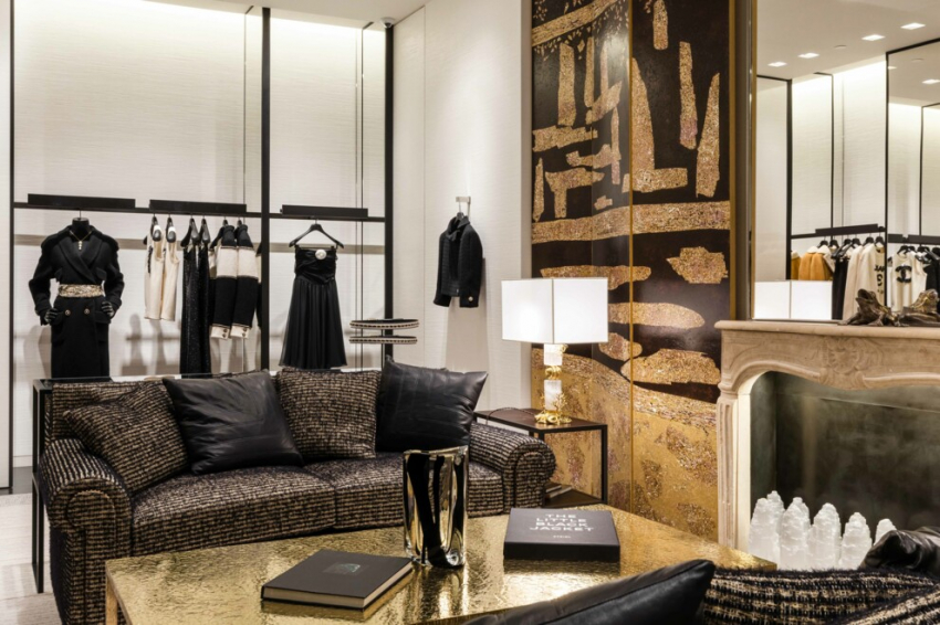 Бутик CHANEL в КиевеЗа ним – обувной салон, обставленный элегантными диванами, дверь слева ведет в самый большой салон RTW с тремя просторными примерочными. Этот салон открывается во вторую, более камерную зону RTW, где есть уютный камин, окруженный роскошными золотыми и черными ширмами. Здесь большая примерочная обеспечивает уединенность.