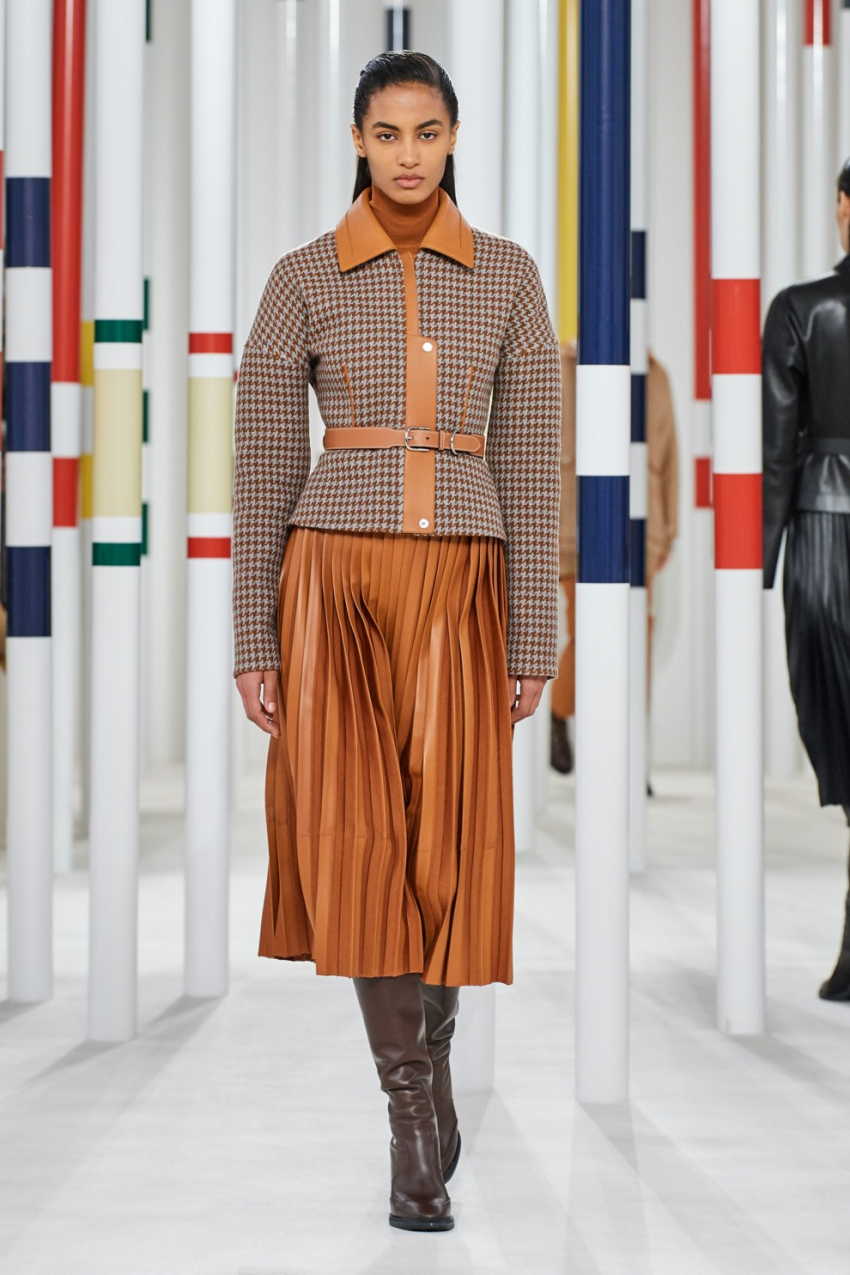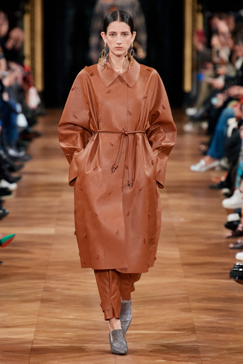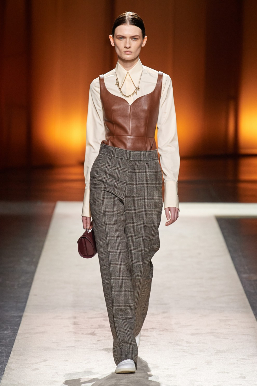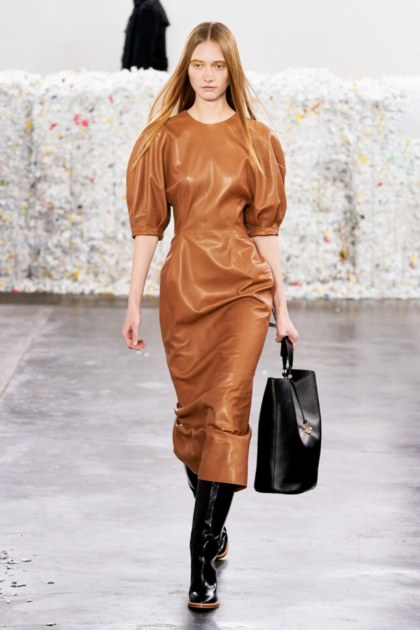 FendiКожаные вещи в оттенке сладкой карамели – модный осенний тренд, который просто необходимо успеть попробовать в этом сезоне. Значительным плюсом кожаных вещей является их самодостаточность. Так, не тратить время с утра, думая, чем дополнить модный кожаный ансамбль. Максимум, что вы можете сделать – добавить массивную цепь или серьги неправильной формы. Кроме того, коричневые кожаные вещи смотрятся стильно как соло, так и паре с другими материалами или оттенками кожи. В этом можно легко убедиться, взглянув на новые коллекции сезона осень-зима 2020/2021: Fendi признались в любви карамельному моно-образу, а Gabriela Hearst скомбинировали кожаное платье в оттенке тростникового сахара с черными аксессуарами.