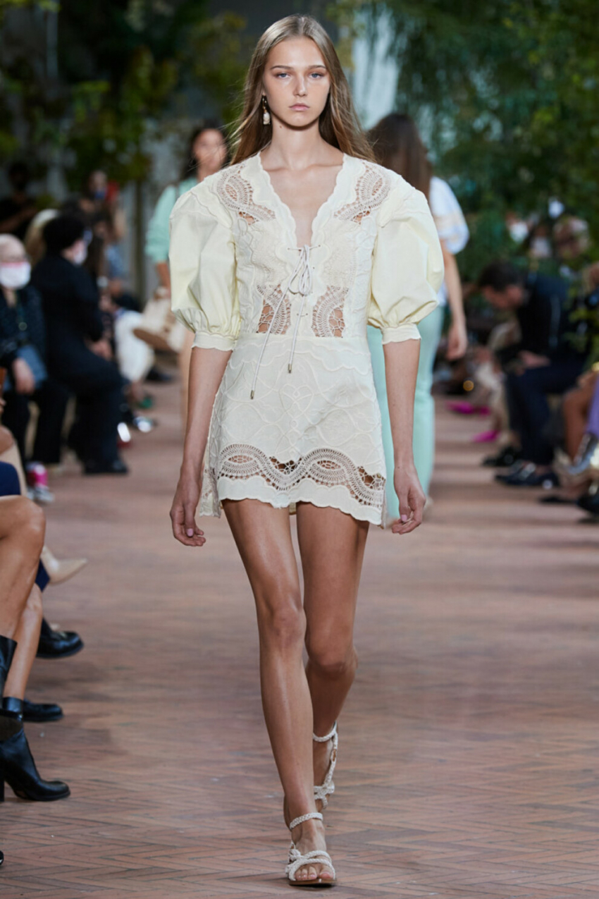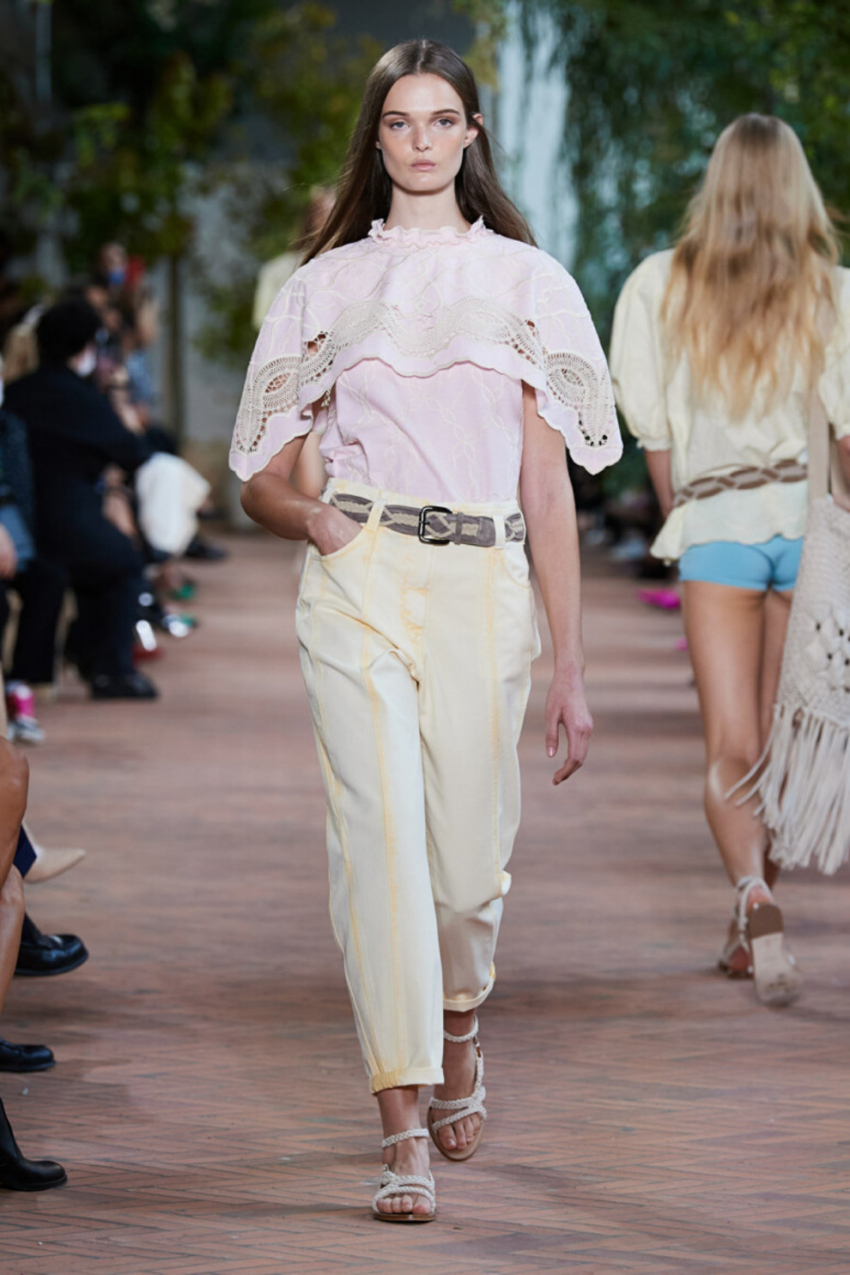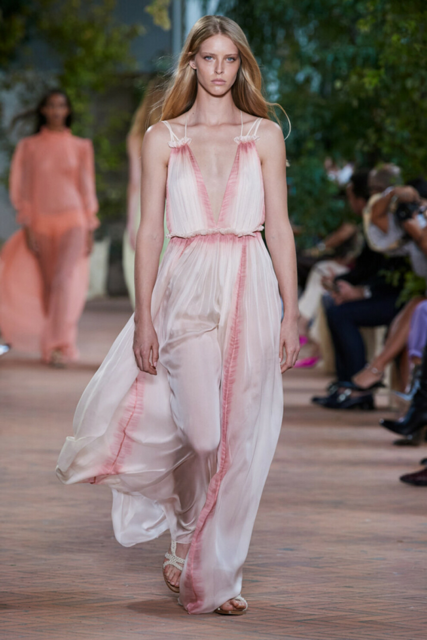 Alberta FerrettiДизайнер полностью отказалась от обуви на каблуке в пользу сандалий на плоском ходу в греческом стиле. Модели демонстрировали деним в пастельных оттенках, украшенный размытыми радужными узорами в стиле хиппи, узкие замшевые брюки с завышенной талией в паре с шелковыми бюстье, комбинезоны были выполнены из кружева сангалло, а свитера ручной вязки выглядели подчеркнуто уютно. Кроме того, на подиуме появились куртки-рубашки, бермуды в натуральных оттенках, укороченные блузы с рукавами-буфами и короткие платья с вышивкой в бельевом стиле. Для вечерних выходов дизайнер подготовила свои фирменные струящиеся платья из шифона.