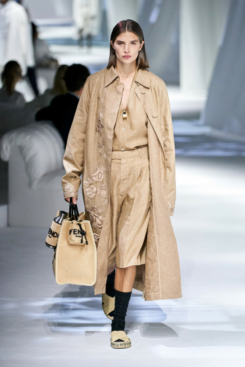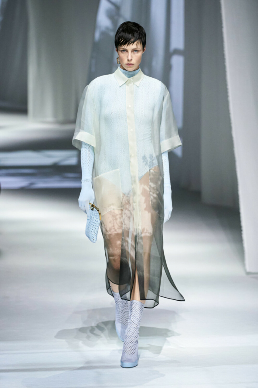 FendiЛюбовь стала связующим звеном в этой коллекции. Домашняя одежда, шелковые платья и парящие кафтаны с деревянным принтом были продолжением прошлогодней будуарной коллекции, однако в этот раз со сладким послевкусием. Большая часть коллекции была сделана из едва окрашенного, но деликатно вышитого льна. Были и безупречные платья-фартуки, соблазняющие своим теплым минимализмом, невесомые туники с изысканными цветочными аппликациями, узкие платья с расклешенными рукавами и мягкий трикотаж с интересным тиснением. На прозрачных платьях, кафтанах, рубашках и брюках были напечатаны изображения видов из оконных рам в голубых и коричневых тонах.