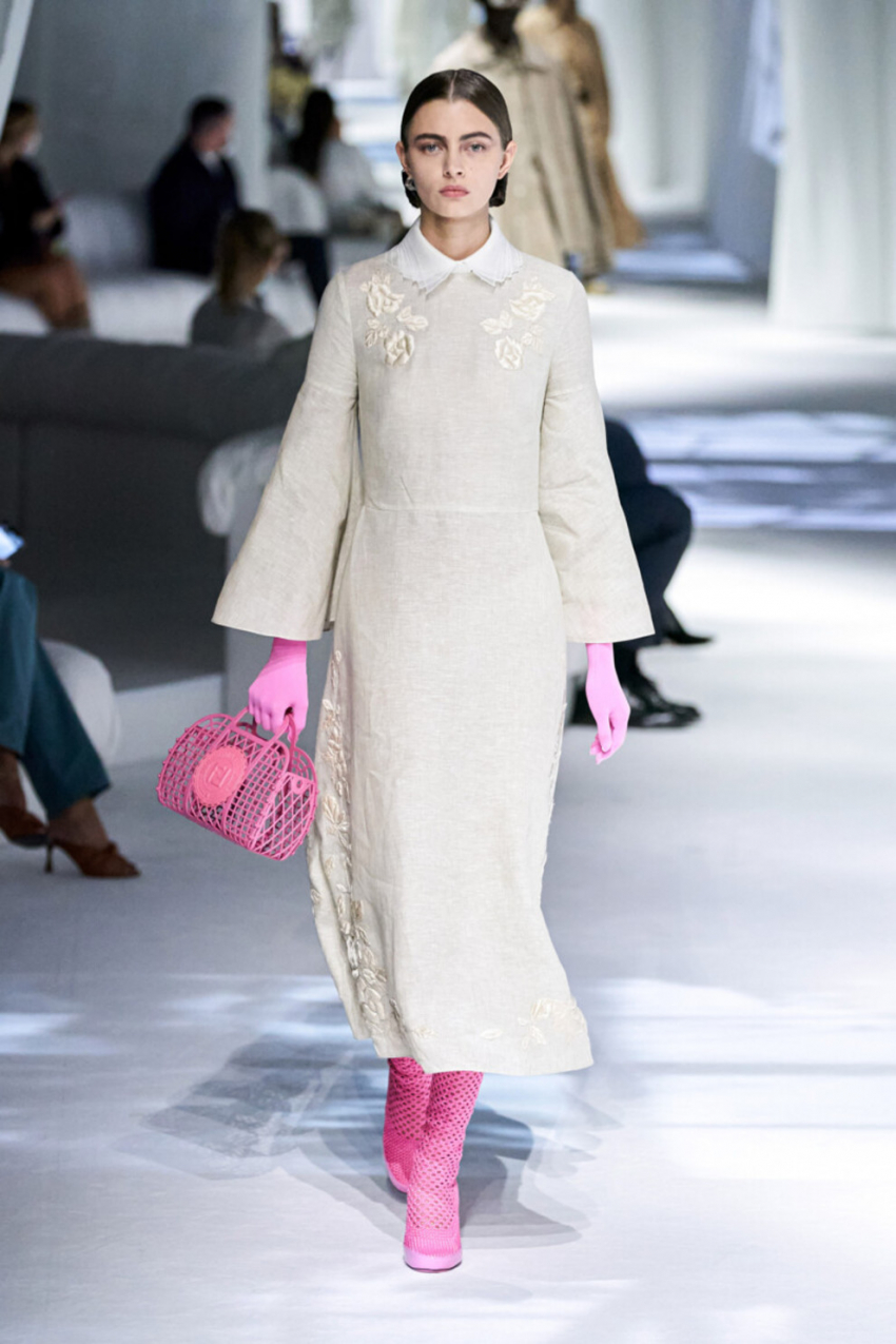 FendiFendi представили новую коллекцию, посвященную красоте маленьких вещей и традиций. Речь пошла о ценностях, заложенных в обычных предметах домашнего обихода, таких как бабушкина скатерть или приданое, которое передавалось из поколения в поколение. "В такой драматический момент я думаю, что говорить о моде только с точки зрения одежды неуместно», - сказала Сильвия Вентурини-Фенди перед показом. «Я считаю, что более уместно говорить о ценностях, связанных с модой, и в моем случае, в моей семье, мода - всегда была как нечто абсолютно значимое».