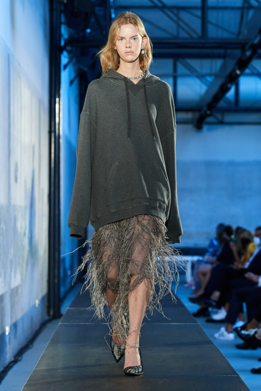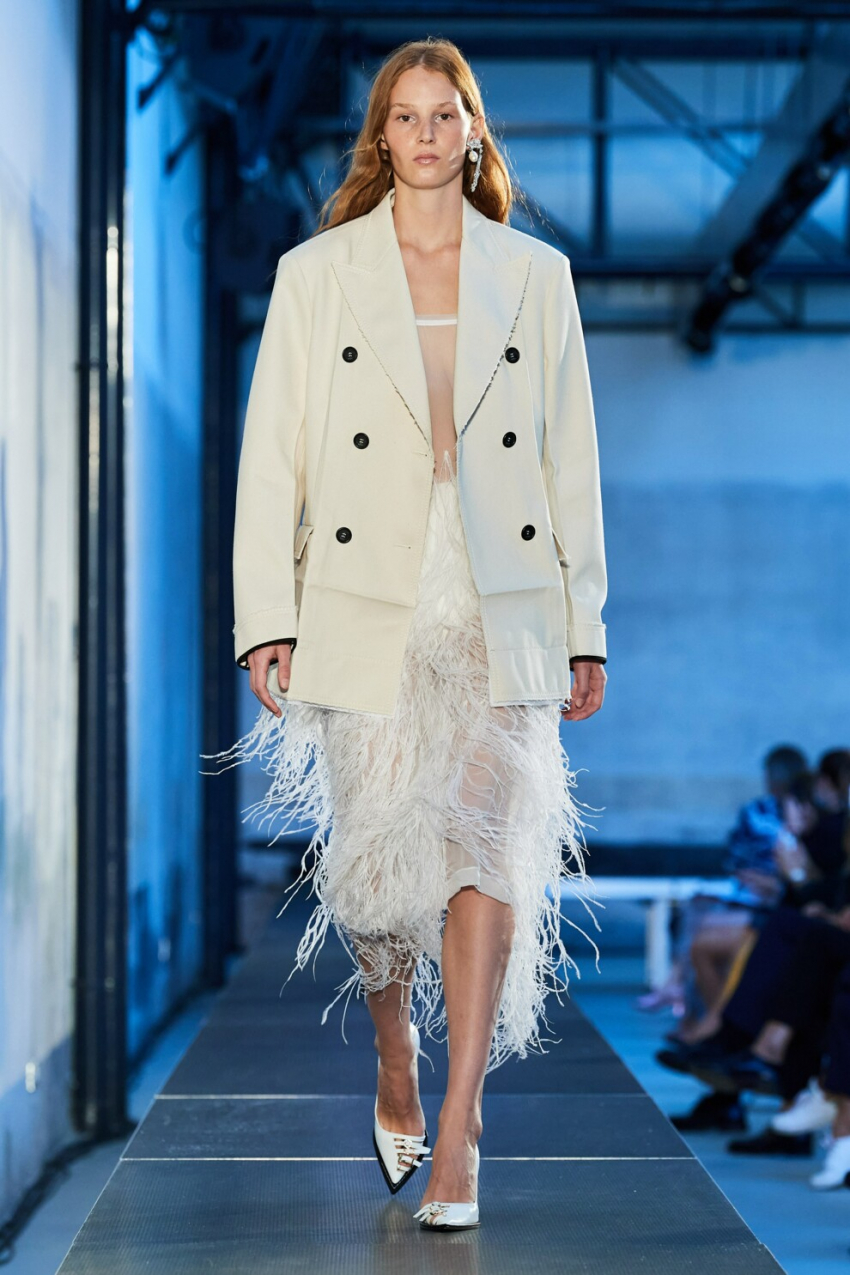 No.21Свою новую коллекцию Алессандро Дель Аква начал с чистого листа - на подуиме появился ряд белоснежных образов, дополненных кутюрными деталями. Дизайнер предложил игру контрастов и противоположностей. Так, нежные юбки с каскадами перьев соседствовали с объемными худи, строгие пальто были дополнены маскулинными рубашками, а кашемировые джемперы имели прозрачные шифоновые вставки на спине.