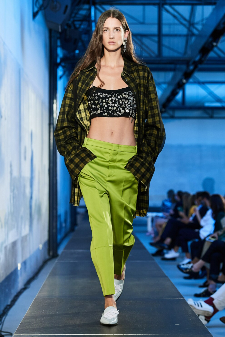 No.21Верхняя одежда была украшена английскими булавками с цветочными мотивами для женщин и жемчужными серьгами, заколоченными в виде брошек для мужчин. Переработанные кнопки и цепочки также были обильно разбросаны по платьям с драпировками из крепдешина, мужским рубашкам, юбкам-карандаш и трикотажным изделиям. Затем коллекция плавно перешла к серо-коричневым оттенкам, а после углубилась в яркие цвета - от кислотно-зеленого до фиолетового. Алессандро Дель Аква показал другую сторону коллекции, где укороченные худи и рубашки сочетаются с фирменными юбками-карандашами, а клетчатые мотивы легко переплетаются с атласными деталями.
