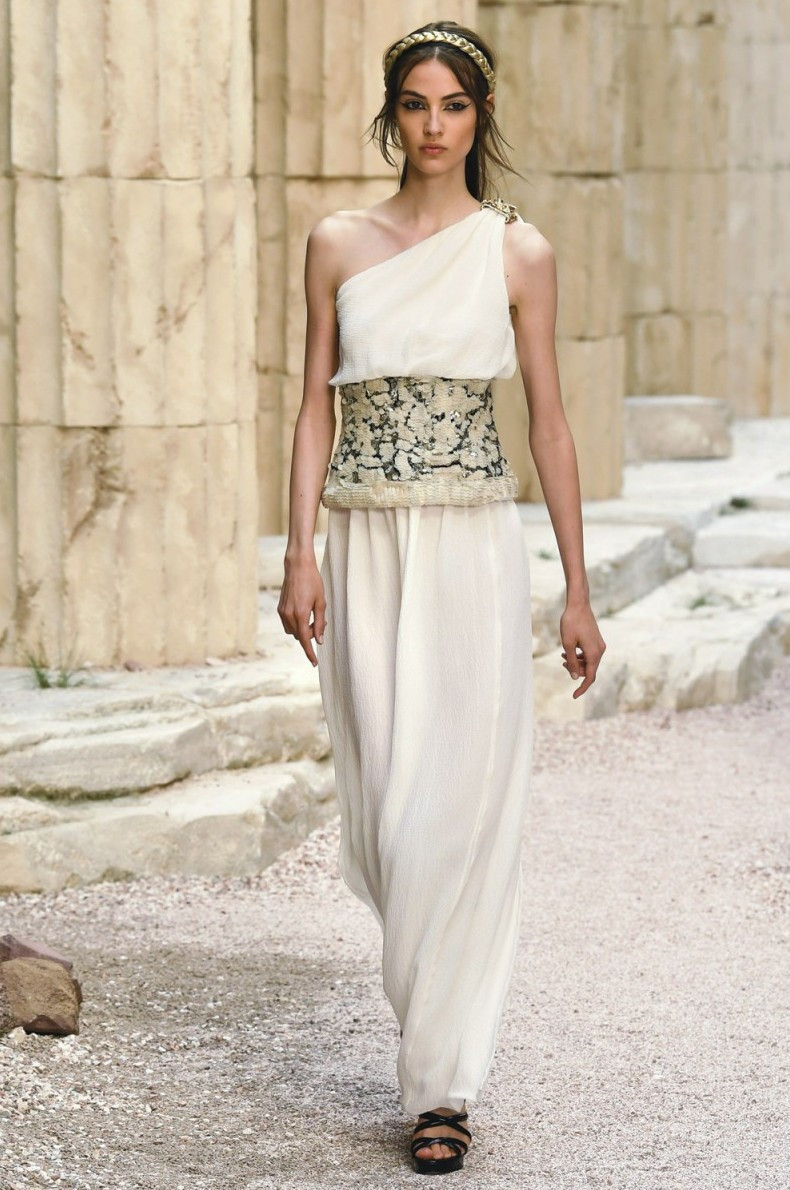 Круизную коллекцию Дома дизайнер Карл Лагерфельд представил в галерее Курбе в парижском Гран-Пале, где все напоминает об античной классике, и это неслучайно — темой коллекции стала Древняя Греция: струящиеся драпировки, тоги и хитоны, пояса и сандалии. Стиль выдержан в мельчайших деталях: вместо пуговиц — древние монеты, на головах моделей — повязки с драгоценными камнями, а в качестве подвесок выступали золотые лавровые листы.