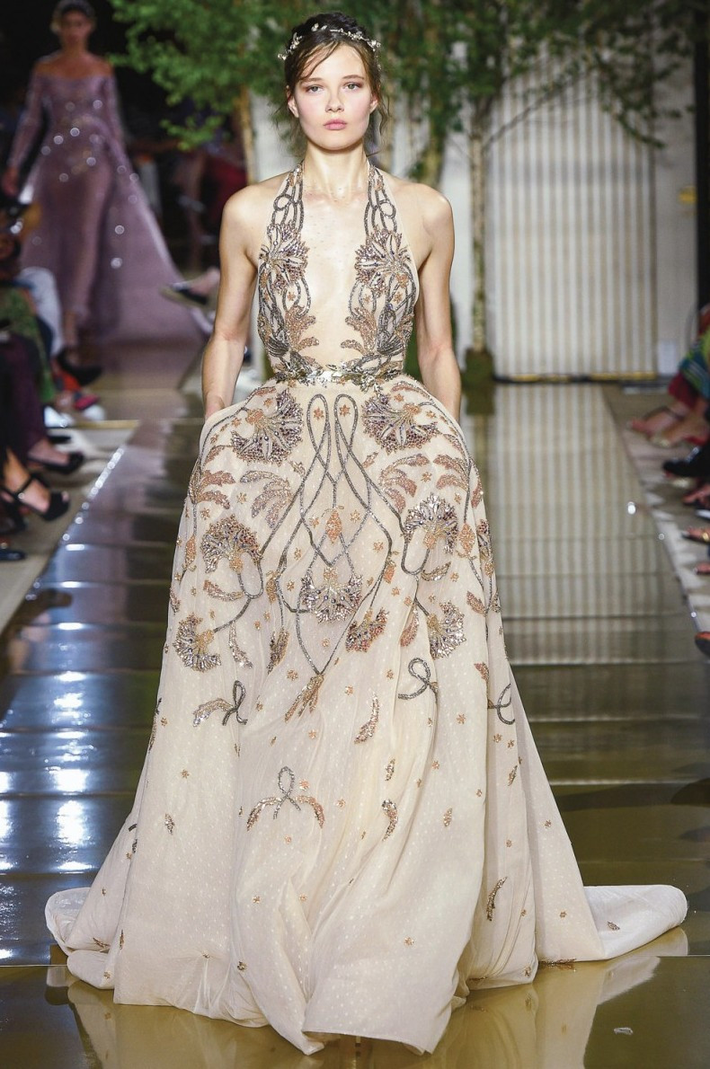 По словам самого Эли Сааба, работая над осенней коллекцией haute couture, он держал в голове сцену из «Игры престолов», где Санса Старк готовится к своей свадьбе. Ее тяжелое расшитое платье и послужило прототипом для роскошных нарядов, представленных ливанским дизайнером на парижском подиуме. Бархат и шелк, золотое шитье и и кожаные детали помогают создать атмосферу вымышленного царства, населенного воинственными королями и героическими женщинами.
