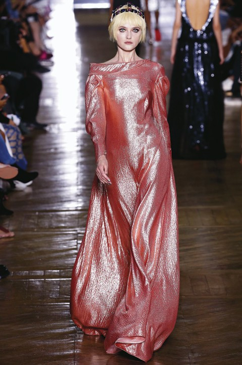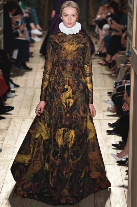 На создание кутюрной коллекции дизайнеров Valentino вдохновил Шекспир. Нашлось место и аллюзиям на поздние платья самой Королевы-девы, и отсылам к моде эпохи Ренессанса, и даже церковным облачениям. Строгие монохромные силуэты сменялись по-королевски роскошными платьями, изобретательными в отделке и выполненными в традиционной для Дома красной гамме.