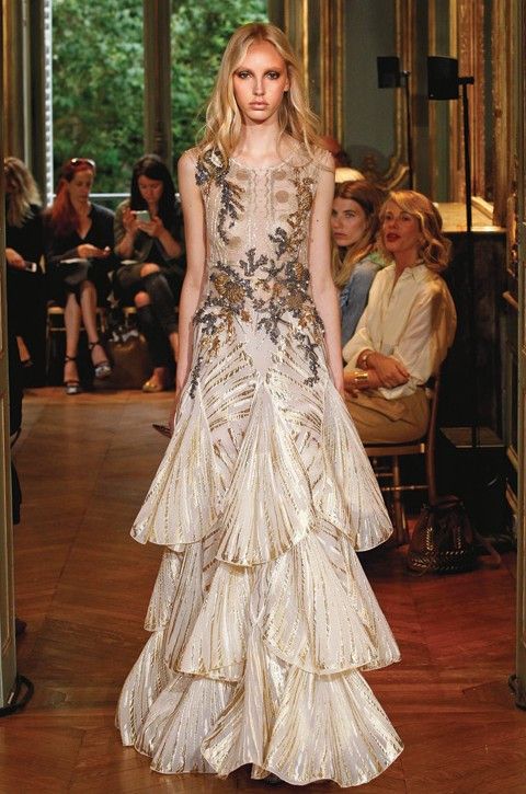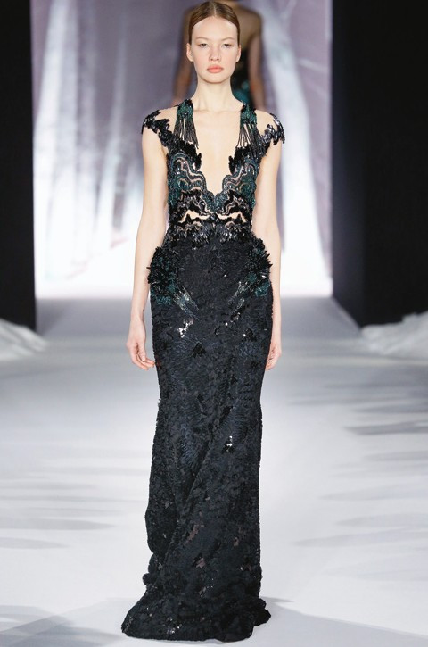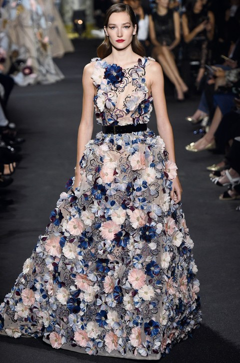Создавая кутюрную коллекцию, Эли Сааб вдохновлялся Нью-Йорком. Ливанский дизайнер смог объединить западный мегаполис с типичной для Востока тягой к роскошной избыточности. Подчеркнуто женственные силуэты отсылают к середине прошлого века, а сюжетную нагрузку принял на себя декор, в рисунках которого угадывались орнаменталистика ар-деко и пышные восточные сады.