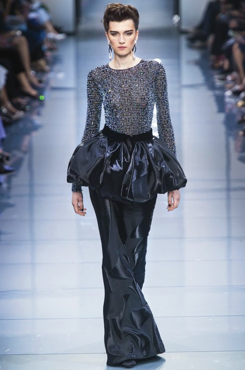 За то время, что Армани одевал пол-Голливуда, он там научился настоящему звездному шику! В новой кутюрной коллекции Джорджио Армани вспоминает итальянский гламур девяностых. На подиуме — дамы в зауженных брюках, точеные жакеты, крупные украшения и безупречные черные очки в оправе классической формы. Шелка с отливом, графические узоры, жестковатые драпировки, немного бархата, шифона, кристаллов и и перьев.