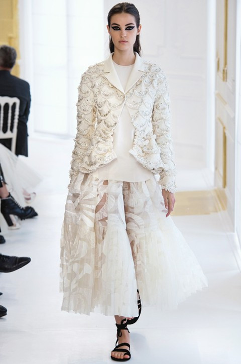 Карл Лагерфельд представил очень сдержанную по цветовой гамме коллекцию, выстроенную по консервативной схеме «день-вечер-особый случай». Королем показа стал твид, элегантно расшитый или украшенный цветочными аппликациями. Почти все комплекты дополняли черная лента с бантиком на голове, черные сапоги-чулки и черные же высокие митенки. В общем, очередное напоминание, что в Париже встречают все еще по одежке.