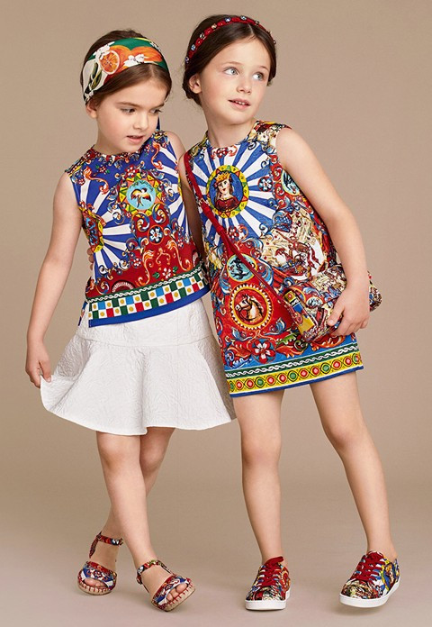 Знаменитый модный дуэт в этом сезоне, как обычно, обратился к культуре родной Италии, но непривычным образом — Стефано и Доменико посмотрели на свою страну глазами туристов: вся их коллекция держится на принтах, воспроизводящих иностранные постеры пятидесятых с видами Капри, Венеции, Рима и Флоренции. Причем и во взрослой, и в детской коллекции использованы практически одни и те же изображения.