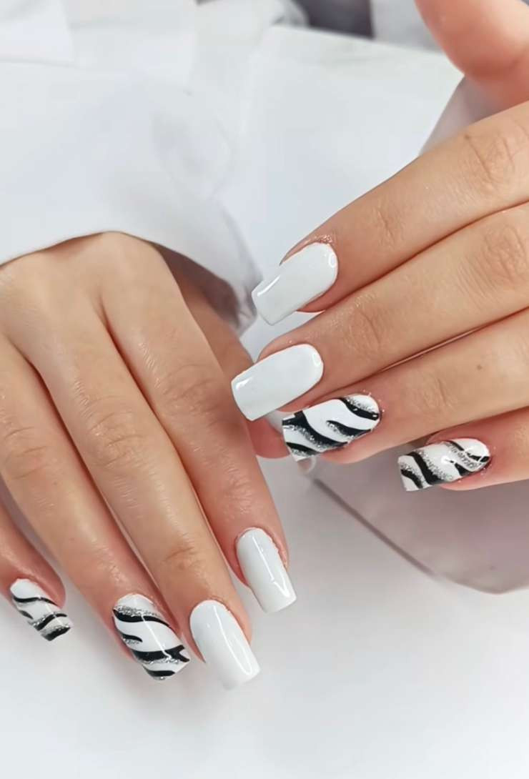 Вот и вернулся сезон, когда варианты белого маникюра можно чередовать хоть каждый месяц до наступления весны. Белый не будет смотреться слишком вызывающе, при этом ваши ногти привлекут внимание без всяких сомнений. Зимой 2024 сделайте ставку на жесткий контраст — выбирайте геометрию, принты и стемпинг в темных оттенках. И да, ближе к новогодним праздникам глиттер не помешает.