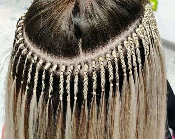 - После из нижних прядей заплетают маленькие косички длиной до 1 см. Впоследствии в них вплетают искусственные волокна.