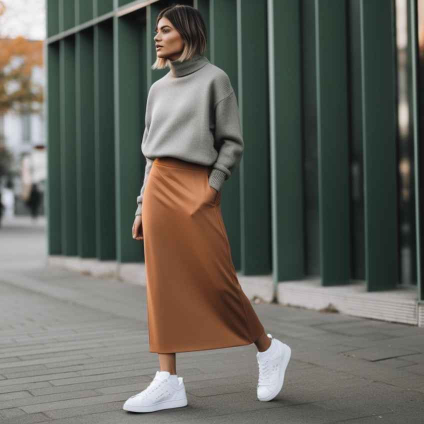 - Лаконичные однотонные кеды, выполненные в сдержанных расцветках, можно комбинировать с трикотажной юбкой-карандаш. Образ можно дополнить водолазкой под горло, пиджаком оверсайз или вязаным кардиганом.