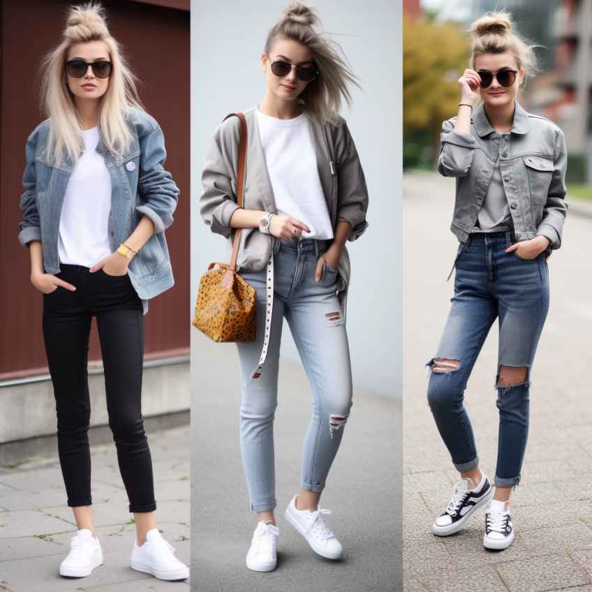- Беспроигрышным вариантом будет сочетание кедов с джинсами всевозможных фасонов. Верх подбирают в соответствии с индивидуальными предпочтениями: в виде футболки, рубашки, женственной блузки, топа или водолазки, пиджака, свитера, кардигана.