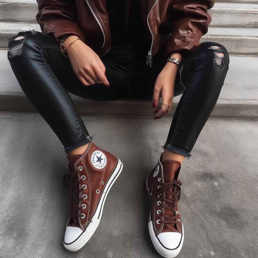 - Стильные конверсы заслуженно считаются универсальной разновидностью обуви. Особенно это актуально для моделей, выполненных в черно-белых расцветках. Конверсы можно совмещать с рваными джинсами и брутальными кожаными «косухами». Наряд получится дерзким и отлично впишется в молодежные образы. При желании сделать лук элегантным прибегают к сочетанию конверсов с классическими прямыми или облегающими фигуру брюками, пальто либо тренчами.