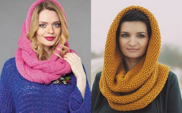 - Универсальным практичным решением станет женский капор, выполняющий одновременно функцию головного убора и шарфа. Изделие зачастую имеет объёмный дизайн, образуя мягкие складки. В тёплую погоду его можно приспустить вниз, создавая имитацию шарфа-снуда.