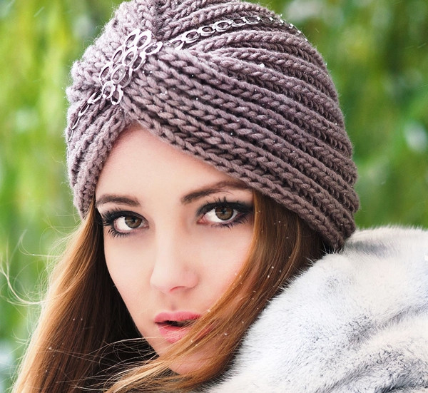 - Оригинальной новинкой станет шапка-чалма, имеющая характерную форму. Передняя часть изделия может быть украшена крупной брошью, выступающей акцентной деталью. Чалма органично смотрится с кашемировыми, твидовыми, шерстяными пальто.