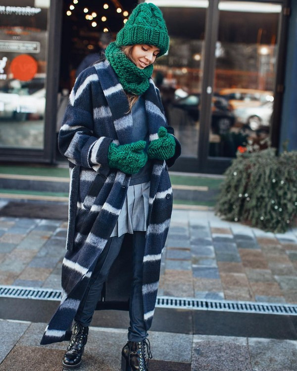- Шапки, связанные из толстых нитей, рекомендуется носить с объёмной верхней одеждой оверсайз. В качестве последней выступают пальто, куртки, пуховики и полушубки.