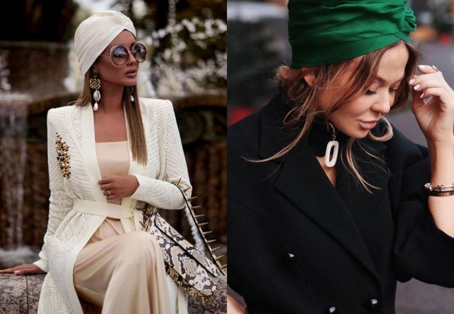 - Аксессуары, сделанные в виде чалмы или берета, требуют комбинирования с элегантной верхней одеждой. Беспроигрышным решением станет совмещение с классическим пальто, имеющим прямой или приталенный крой.