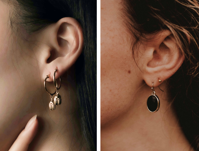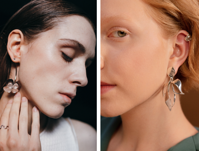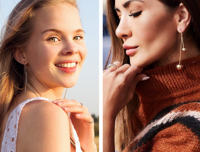 - Украшение должно гармонично сочетаться с выбранным нарядом. Открытую область плеч, зону декольте и высокую причёску подчёркивают с помощью длинных серег. Для повседневной носки подойдут миниатюрные аксессуары или украшения средних размеров.