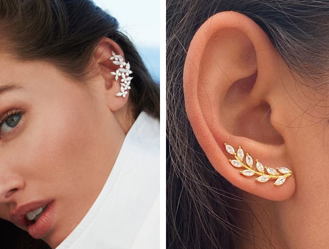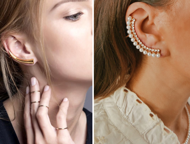 - Неизменно актуальными остаются клаймберы, имеющие дугообразную форму, пролегающую от мочки до верхней части ушной раковины. Приветствуется украшение изделий россыпью мелких жемчужин.
