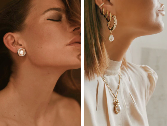 - Подчеркнуть оттенок кожи лица можно с помощью удачно подобранной тональности аксессуаров. Белое золото предпочтительно для женщин с холодным тоном кожи. Также удачно будут смотреться вставки, выполненные из светлого жемчуга либо бриллиантов. Девушкам с тёплым тоном кожи стоит отдать предпочтение жёлтому золоту.