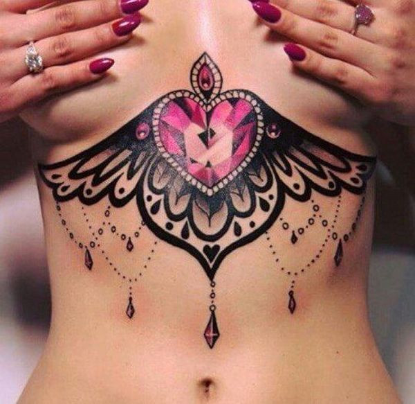 - Крупные татуировки под грудью позволят в полной мере проявить фантазию. Примером служит изображение сердца, дополненного крыльями птицы. Роза гармонично смотрится в сочетании с кружевными орнаментами.