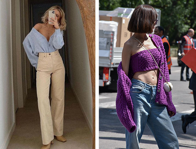 Абсолютный хит 2023 года — широкие брюки и джинсы с высокой посадкой. Их можно носить с кроп-моделями кардиганов. Такой ход позволяет выделить талию. При этом кардиган может быть как свободным, так и максимально тонким и облегающим. Завершите свой образ грубыми ботинками или милыми туфлями — смотрите по стилю и настроению.