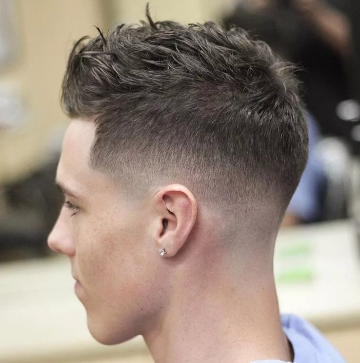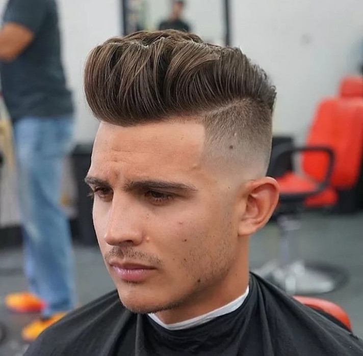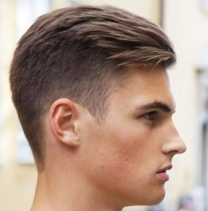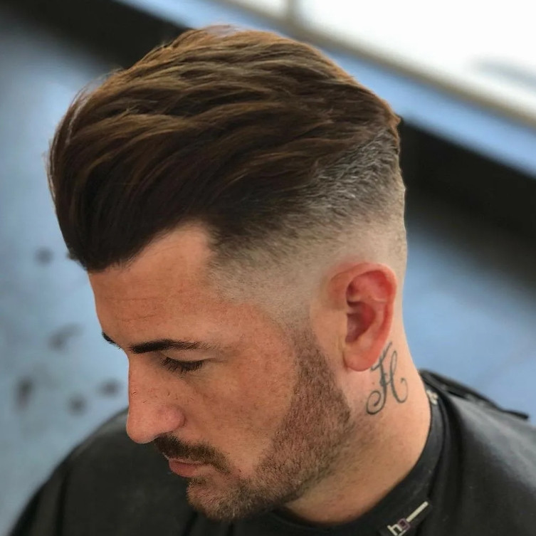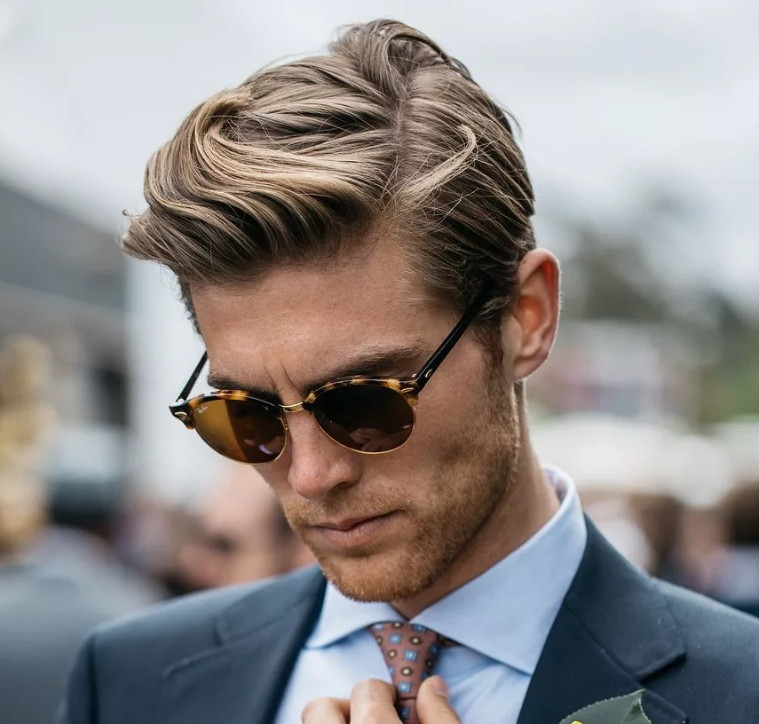 Любителям классики и элегантности стилисты предлагают стрижки на волосы средней длины, которые сочетаются с укороченными до 3 см висками и затылком. Самые длинные волосы оставляют на макушке и для челки — 8 см. Верх получается более объемным, а волосы на висках и затылке стригут, а не бреют. Такие прически нужно обязательно укладывать, чтобы они держали форму.