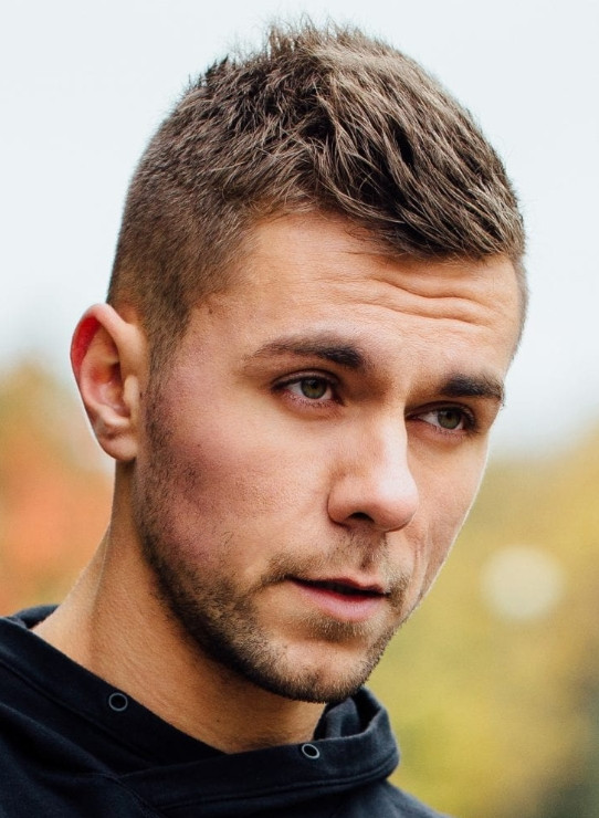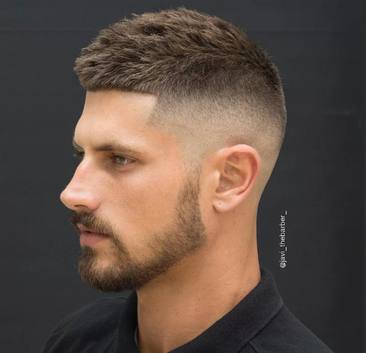 Еще одна модная модель прически для жестких и густых волос — «милитари». Она стрижется ступеньками, возможны варианты с челкой разной длины, что позволяет носить такую прическу мужчинам с разным типом лица. Среди модных коротких стрижек наступающего сезона можно выделить и спортивную — короткая макушка и бритые под ноль виски с затылком.