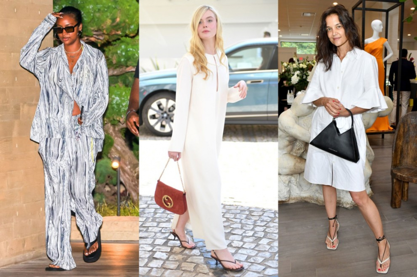 Белла Гадід, Кеке Палмер, Джіджі ГадідВ'єтнамкиВ'єтнамки давно перестали бути винятково взуттям для пляжу або басейну, зараз вони доречні і в міському гардеробі. Цього сезону наймодніші в'єтнамки обзавелися підборами або широкою платформою. Так, Кеті Голмс носила в'єтнамки з вишуканими ремінцями Сhristian Siriano в Нью-Йорку, Ель Фаннінг з'явилася у шльопанцях на підборах на Каннському кінофестивалю, а співачка Джастін Скай віддала перевагу в'єтнамкам на масивній платформі.