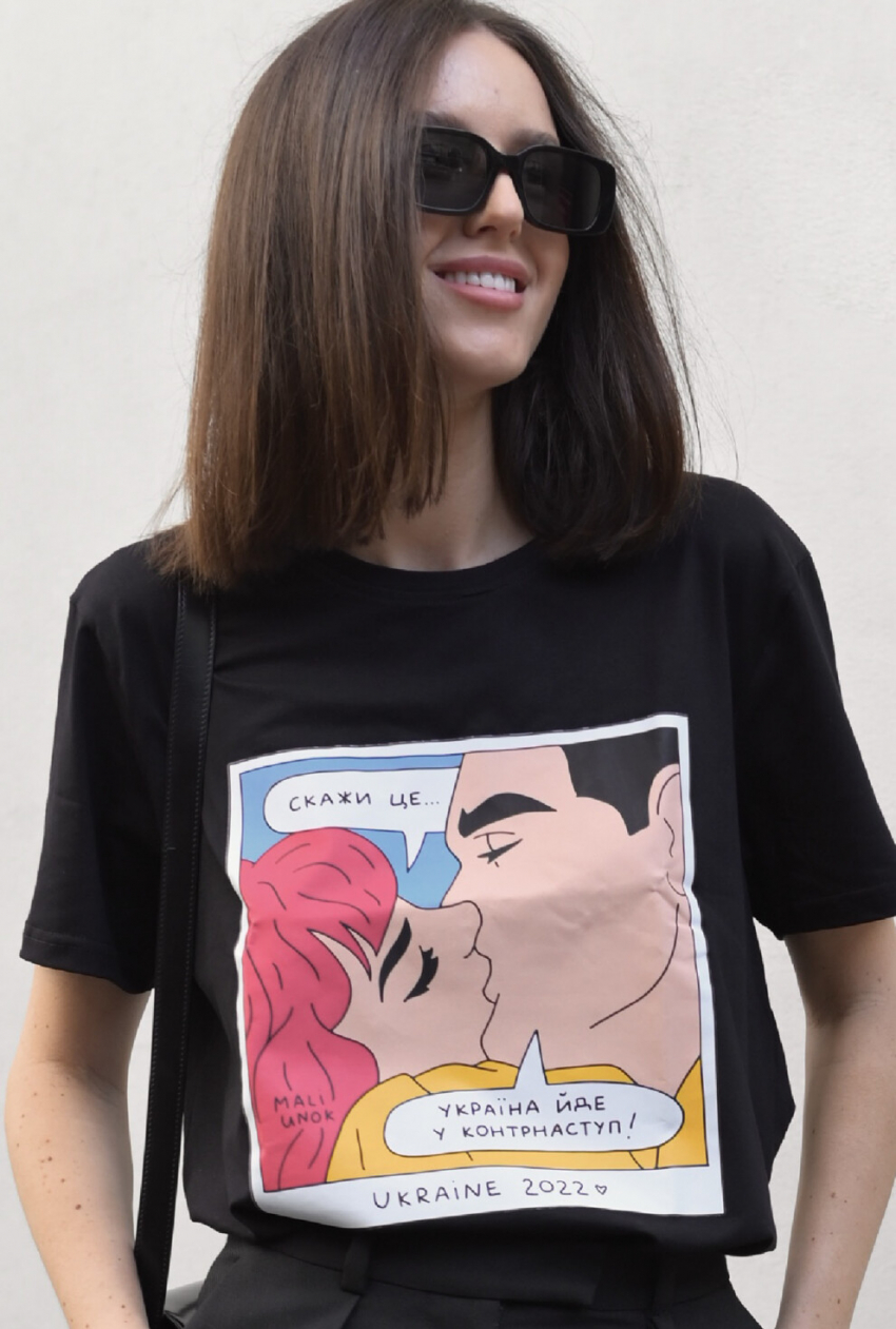 Футболка "Контрнаступ", рюкзак, наліпкиТетяна Кодзаєва, інфлюенсерка та дизайнеркаЯ вірю в масовий фандрайзинг і вважаю, що краще, коли мільйон українців дасть по гривні, ніж одна людина дасть мільйон. Ця колекція – чудовий приклад того, що долучитися до важливої справи сьогодні може кожен з нас. Купівля худі, футболки або просто шкарпеток – це вже ваш важливий внесок. Ще мені дуже приємно, що під час утілення в життя проєкту "Ми однієї крові" залучили українських ілюстраторів – сьогодні не можна забувати, що креативна індустрія потребує нашої підтримки, багато митців втратили змогу творити та підтримувати власні родини. Сьогодні всі ми, особливо люди з великою аудиторією, мають дати зрозуміти світові, що найлегший і найшвидший спосіб допомогти Україні – це купувати українське, чи то виріб, чи то послуга тощо. У такий спосіб ми популяризуватимемо українське й допомагатимемо нашій Батьківщині додатково.