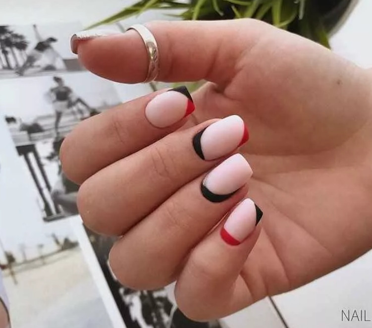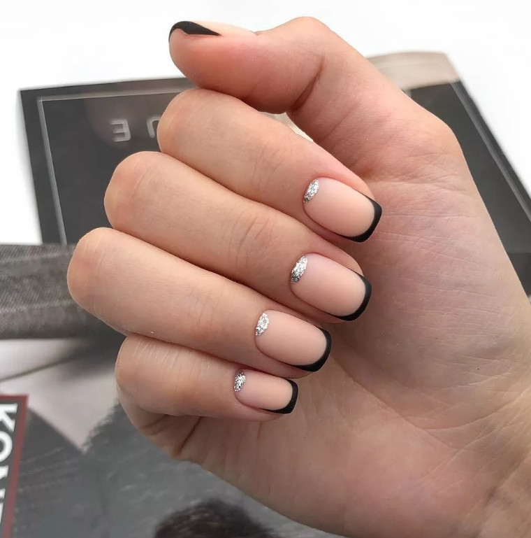 Черный френч выглядит элегантно и эксцентрично. Его обычно предпочитают деловые дамы. В моде классическое сочетание белого и черного. Эти цвета смотрятся очень гармонично. Также актуально будет сделать зеркальное оформление. Черная втирка на нюдовом фоне придаст вашему образу нотку нежности и легкого шарма.
