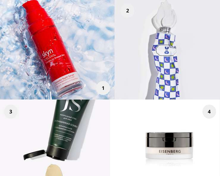 1. Омолаживающая сыворотка для кожи под глазами Icelandic Youth Cooling Eye Roller Skyn Iceland. 2. Cha U Kao Маска для лица Mushroom Glow. 3. JS Крем-концентрат «Ультраувлажнение». 4. Рассыпчатая гипоаллергенная пудра для безупречной и сияющей кожи, EISENBERG.