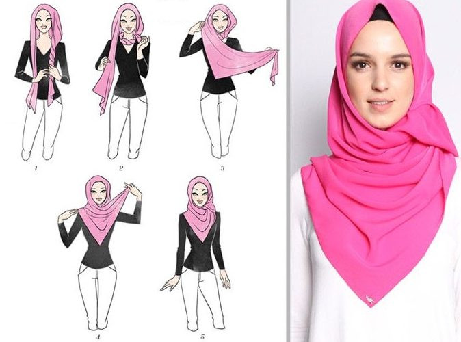 Можно красиво носить платок, как это делают девушки-мусульманки. Способ непростой. Для него требуется большой по размеру аксессуар, длиной 120-140 см, так как им нужно закрыть полностью волосы и шею. Схема завязывания:
