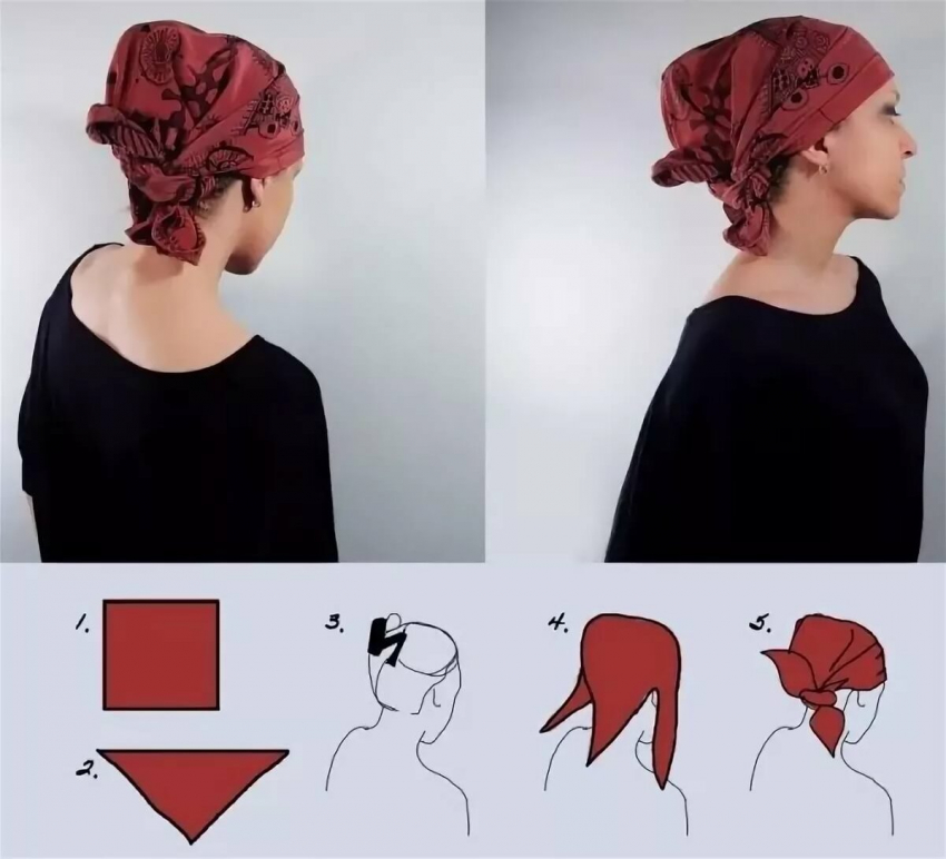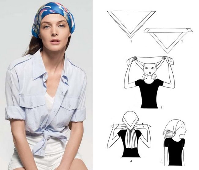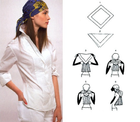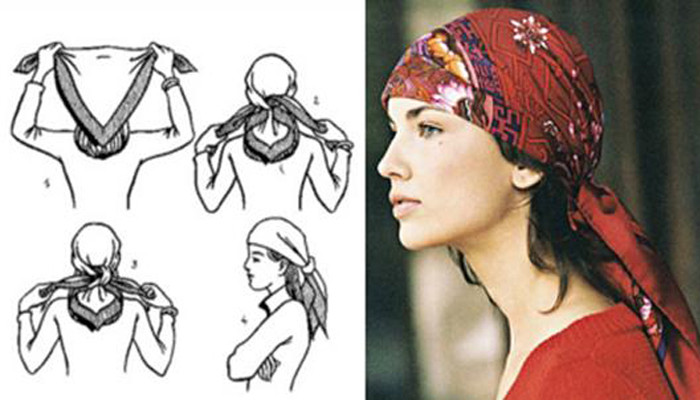 - Косынка кладется на голову по диагонали. Ее кончики должны оказаться сбоку.