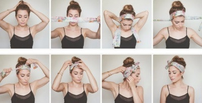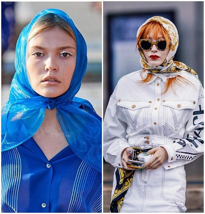 Если вы боитесь, что в таком образе будете похожи на бабушку или «барышню-крестьянку», завяжите кончики платка сзади. Этот стиль, дополненный очками, называется «голливудский». Также вы можете свернуть платок в виде широкой повязки либо банданы.