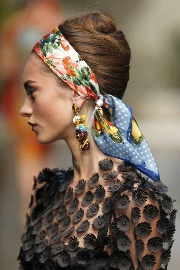 Вы можете менять свой облик, повязывая платок на голове по-разному. Попробуйте сделать этим летом объемный тюрбан, украсив его цветами, бантиками, завязками впереди.