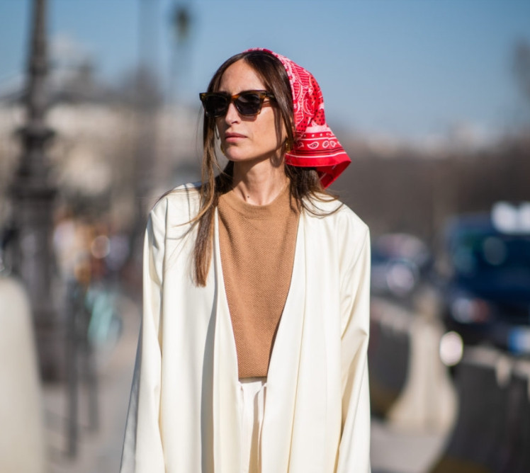Кстати, принт и цвет вашей косынки тоже имеет значение. Выбирайте модные цвета 2021 года: классический синий, красный, оранжевый, белый. Принт – полоска, цветы или классический орнамент культового шелкового платка каре, как у бренда Hermes. Сегодня, к счастью, можно найти модели поскромнее.