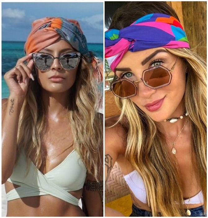 Длинные распущенные локоны, круглые очки и яркий платок на голове сегодня выдают в девушке, скорее, стильную штучку, чем вечную бунтарку. Подобный образ так и просится к морю. Скорее надевайте модный купальник 2021-2022, завязывайте на голову шарф или платок в стиле бохо и отправляйтесь на пляж.